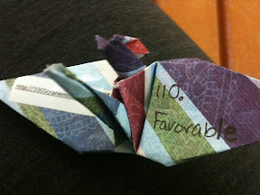 "I recently returned from a deployment to Iraq, and am visiting my parents in Virginia for the first time in a year. I went to the Smithsonian Museum of Natural History with my father yesterday, and as I was admiring the expo on ancient humans, I noticed one of your cranes right on the table next to me. Number 103, savor reminds me to savor the time that I have with my family right now. I will hold onto this crane and place it somewhere in Tacoma, WA, when I return to Fort Lewis next week! Thanks for such an interesting and thought provoking idea."